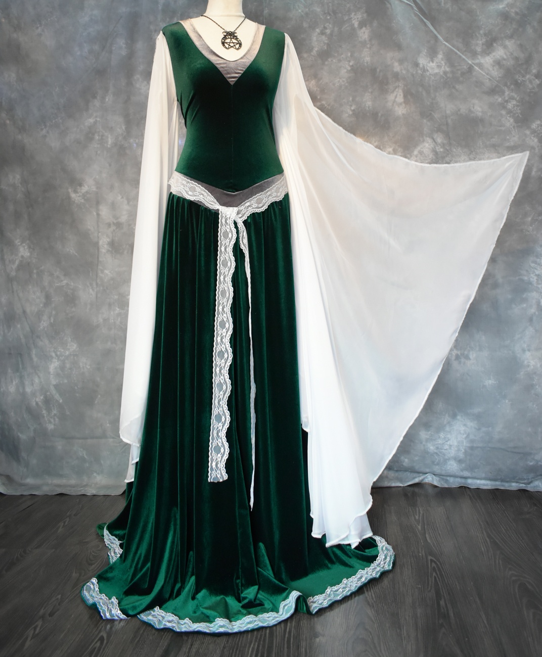 Hows this for a beautiful combination - a custom gown combining the body and skirt of the Wight Enchantress Gown in Forest and Pewter, with Fae of the Falls Gown sleeves in white mesh - gorgeous! Want one, or something similar? Just ask us!